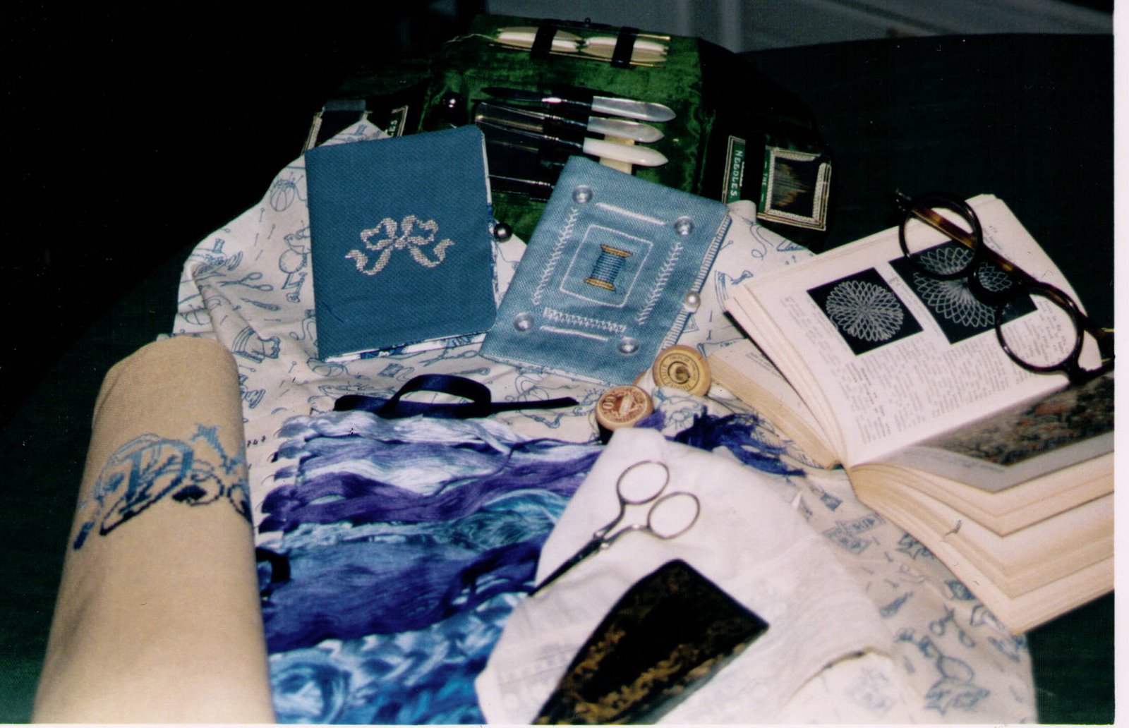 La trousse de couture verte, le porte-ciseaux, ciseaux, bobines et livre font partie de ma collection.